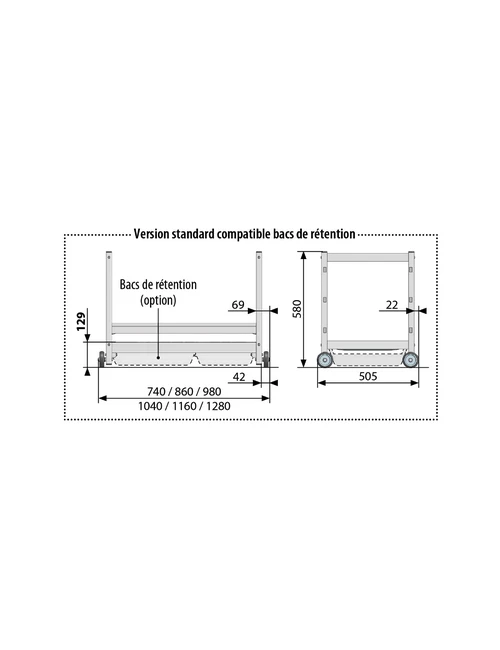 - Hors-tout roulettes comprises 740, 860, 980, 1040, 1160 et 1280 mm