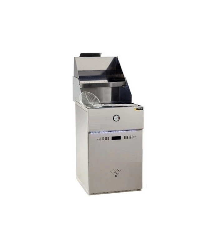 Friteuse gaz de très bonne qualité, plus perfomante et plus économique. Les évacuations des vapeurs grasses et des gaz brûlés sont cumulés dans un caisson avec une sortie latérale.