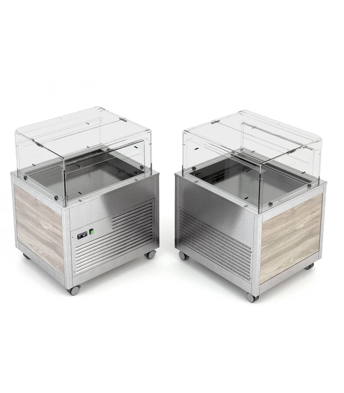 - Option T : rallonge latérale en bois pour la présentation d’aliments neutres : 77x23x175 cm