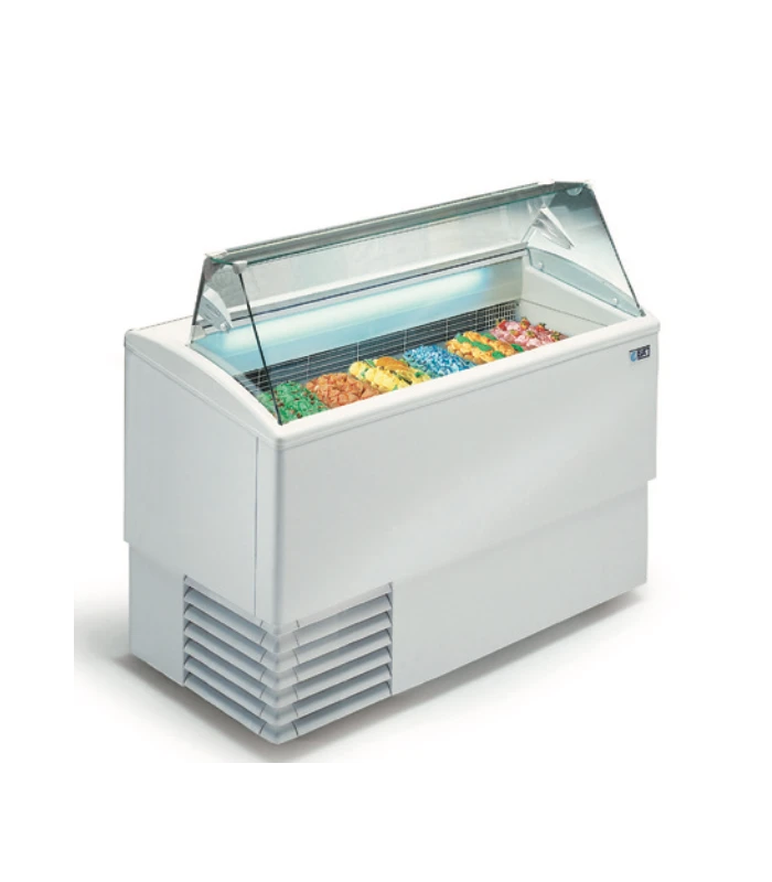 Vente de vitrine Ă glaces Ă vitre droite pour glacier. Cette vitrine Ă crĂšme glacĂ©es est dotĂ©e d’un Ă©vaporateur statique et d’un groupe frigorifique qui garantit l’excellente conservation de la glace mĂȘme en classe climatique 4+ (35°C de tempĂ©rature ambiante et 70% HR). De fabrication italienne. Â