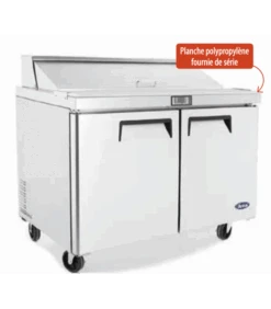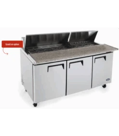 Vente de saladette rĂ©frigĂ©rĂ©e avec compartiment pour bacs gastronormes 1/6 inclus, idĂ©al pour votre cuisine de restaurant. Ce meuble froid convient pour la prĂ©paration des sandwichs et pizzas. Cette table de prĂ©paration est Ă©quipĂ©e d’une planche en polyĂ©thylĂšne amovible. 3 modĂšles existent : 12 x GN 1/6, 16 x GN 1/6 ou 18 x GN 1/6. IdĂ©al pour les restaurants.