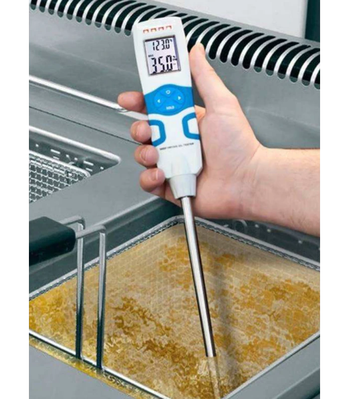 L’huile de friture se deÌgrade au fil du temps, sous l’effet constant de la chaleur et des processus chimiques associeÌs, ce qui entraiÌne une deÌteÌrioration de la friture et une accumulation de substances nocives dans l’huile.Un moyen simple, rapide et utile pour controÌler l’huile de friture dans le domaine de la gastronomie est de mesurer la proportion de TPM (Total Polar Materials) dans l’huile, ce qui est par ailleurs exigeÌ par la loi dans la plupart des pays. GraÌce aÌ la technique utiliseÌe, notre testeur est adapteÌ pour mesurer une grande varieÌteÌ de graisses de friture, par exemple l’huile de soja, de seÌsame, de colza, de tournesol ainsi que les graisses veÌgeÌtales et animales. Une mesure de la tempeÌrature exacte de l’huile est en outre effectueÌe sur l’affichage LCD eÌclaireÌ et une mention Bon / Mauvais est afficheÌe par l’intermeÌdiaire des quatre LED situeÌes au niveau de la teÌte de l’appareil. Cet appareil est ainsi ideÌal au quotidien pour obtenir une mesure professionnelle de la qualiteÌ de l’huile dans le secteur de la gastronomie ou dans sa cuisine aÌ la maison.Â