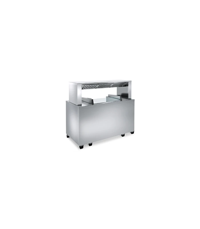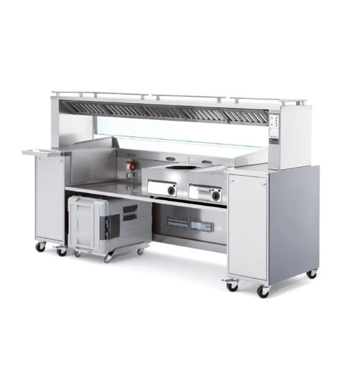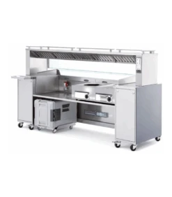 Cette station de cuisine mobile permet de pratiquer la cuisine de spectacle dans des endroits clos notament grĂące Ă sa hotte aspirante. ModĂšles disponibles de la vitrine roulante prĂȘte Ă cuisiner : 2, 3 ou 4 appareils de cuisson. IdĂ©al pour les professionnels de la restauration. De fabrication allemande.Â