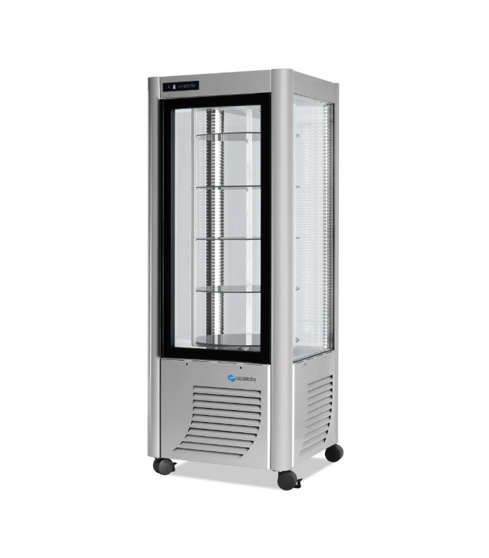 Cette vitrine pâtissière à 4 faces vitrées offre une vision panoramique de vos réalisations. D’une capacité de 400 litres, la vitrine d’exposition possède 5 plateaux tournants. Fabricant italien SCAIOLA.