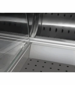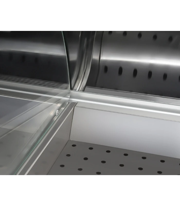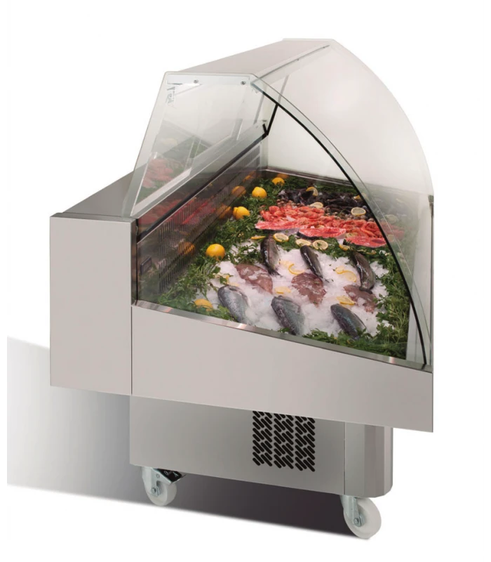 Cette vitrine comptoir réfrigérée spéciale poissons est montée sur roulettes afin de faciliter le transport. Le présentoir à poissons est conçu en acier inox AISI 304 18/10. De fabrication européenne.